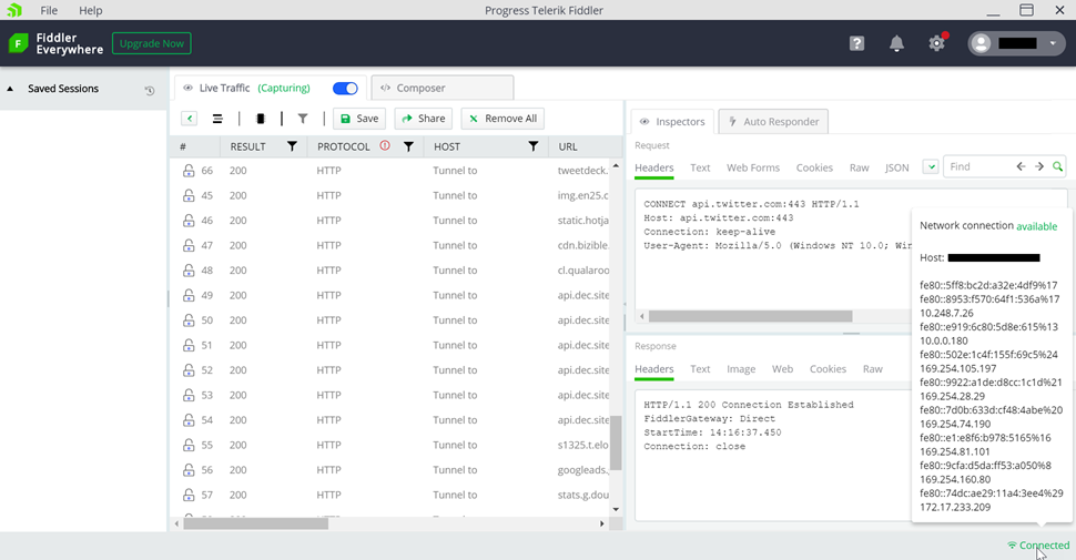 5. In the bottom right corner of the Fiddler, there is a connection status. Does it say connected or disconnected? See the below screenshot for a visual reference.