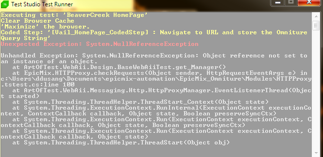 using Telerik.TestingFramework.Controls.KendoUI;using Telerik.WebAii.Controls.Html;using Telerik.WebAii.Controls.Xaml;using System;using System.Collections.Generic;using System.Text;using System.Linq;using System.Web;using ArtOfTest.Common.UnitTesting;using ArtOfTest.WebAii.Core;using ArtOfTest.WebAii.Controls.HtmlControls;using ArtOfTest.WebAii.Controls.HtmlControls.HtmlAsserts;using ArtOfTest.WebAii.Design;using ArtOfTest.WebAii.Design.Execution;using ArtOfTest.WebAii.ObjectModel;using ArtOfTest.WebAii.Silverlight;using ArtOfTest.WebAii.Silverlight.UI;using ArtOfTest.WebAii.Messaging.Http; //Needed for Telerik HTTPProxynamespace EpicMix{ public class HTTPProxy : BaseWebAiiTest { #region [ Dynamic Pages Reference ] private Pages _pages; public List<Dictionary<string, string>> ResponseDictionaries = new List<Dictionary<string, string>>(); /// <summary> /// Gets the Pages object that has references /// to all the elements, frames or regions /// in this project. /// </summary> public Pages Pages { get { if (_pages == null) { _pages = new Pages(Manager.Current); } return _pages; } } #endregion // START TEST VARIABLES // Omniture URL (partial) private string omnitureUrl = @".snow.com/b/ss/"; // Dictionary to hold the query string parameters and values private static Dictionary<string, string> dictionary = null; // END TEST VARIABLES //******************************************************************************************************************************************************* // Navigate to Url and get Omniture public List<Dictionary<string, string>> NavigateToUnauthenticatedUrl(string testUrl) { // Check for Ensighten Request RequestListenerInfo ensReq = new RequestListenerInfo(checkRequests); Manager.Current.Http.AddBeforeRequestListener(ensReq); // Add our HTTP response event handler. For each response the proxy gets, parse for the Omniture URL's query string parameters ResponseListenerInfo li = new ResponseListenerInfo(GetQueryStringParamatersAndValues); Manager.Current.Http.AddBeforeResponseListener(li); // Navigate to the given URL (passed in from the test case) Manager.Current.ActiveBrowser.NavigateTo(testUrl); // Wait '5000' msec for url:'{testUrl}' Manager.Current.ActiveBrowser.WaitForUrl(testUrl, true, 5000); // Wait for the page to completely load Manager.Current.ActiveBrowser.Frames.WaitAllUntilReady(); // We don't need the event handler any longer. Removing it stops listening to responses in the proxy Manager.Current.Http.RemoveBeforeResponseListener(li); Manager.Current.Http.RemoveBeforeRequestListener(ensReq); return ResponseDictionaries; } private void checkRequests(object sender, HttpRequestEventArgs e) { try{ Manager.Log.WriteLine(String.Format("Request for {0}", e.Request.RequestUri)); } catch (NullReferenceException nre) { Manager.Log.WriteLine("Request E is null" + nre.Message); } }}}Thanks for all details shared and excuse us for the delay.