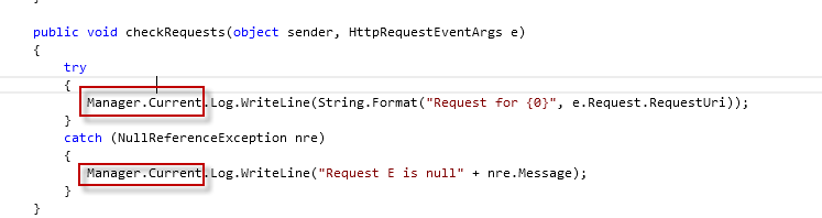 I was able to find out what causes the issue. In the HTTPProxy class where the Log.WriteLine is failing with NullReference you should add Manager.Current in front to specify the current threading. Please refer to the attached screenshot and edit the project accordingly.