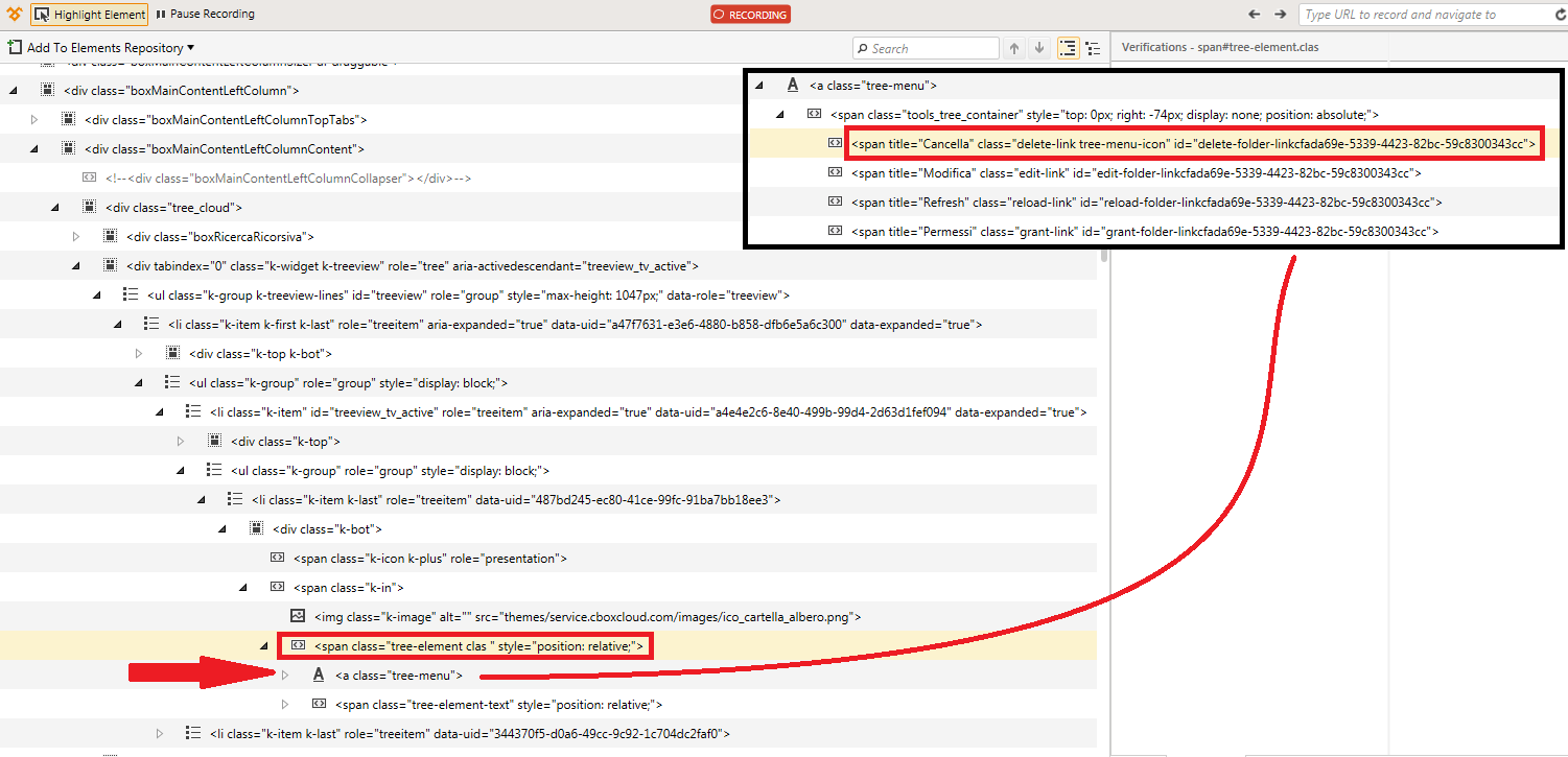 Up until now I've correctly managed to access a specific folder in the treeview (using the DOM features of the test recorder/runner) to delete it just once, but my problem relies in the dynamic naming of the single HTML elements which build up the treeview.