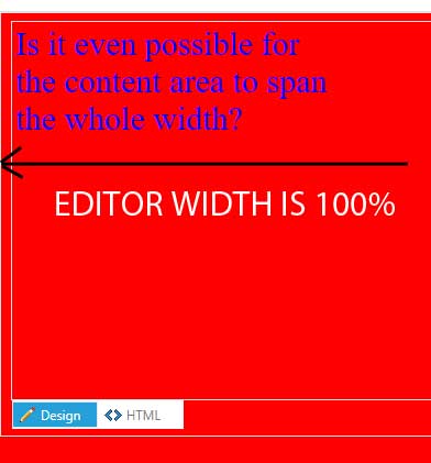 I've read all the previous questions on this but still cannot get it to work. I need the editor content area to be full width in the page. Is this possible please? No other css is affecting this - please see the attached image. Thanks, Jon
