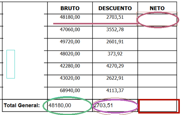 - And the last thing is I want to do a subtraction of the total of NETO and DESCUENTO in the last bottom right corner