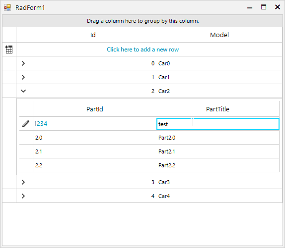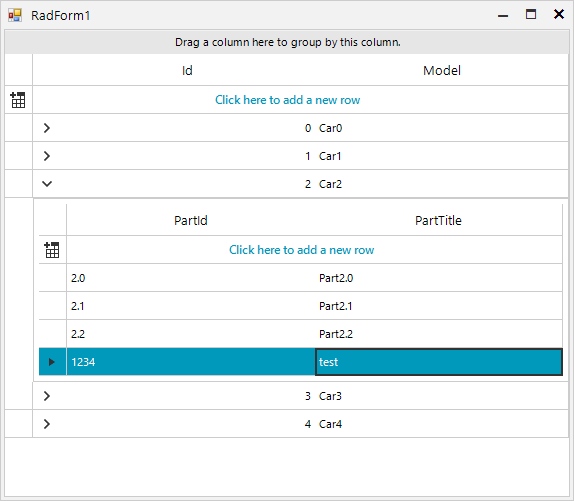 For your convenience, I have prepared a sample project to demonstrate the above settings. When you run the project, expand the row, you can observe how the second column cell is empty. This is because the fieldname property of the second column is not set. You can debug this in your project.