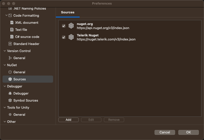I am running Visual Studio 2022 v17.4 for MACOS and this are my Nuget Sources: