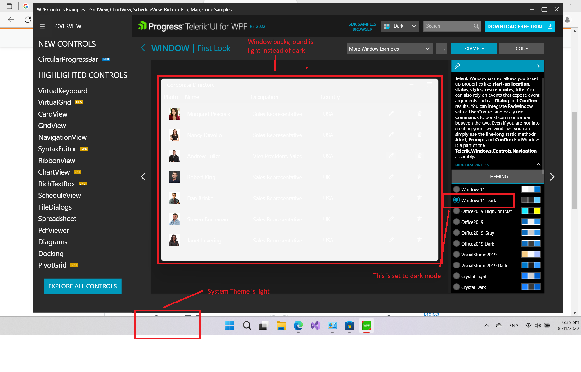 If System Theme is set to Light, then the Dark Mode in RadWindow will not work correctly and similarly if System Theme is set to Dark then the Light Mode in RadWindow does not work correctly. This problem can be observed even in the Telerik's own control examples app.