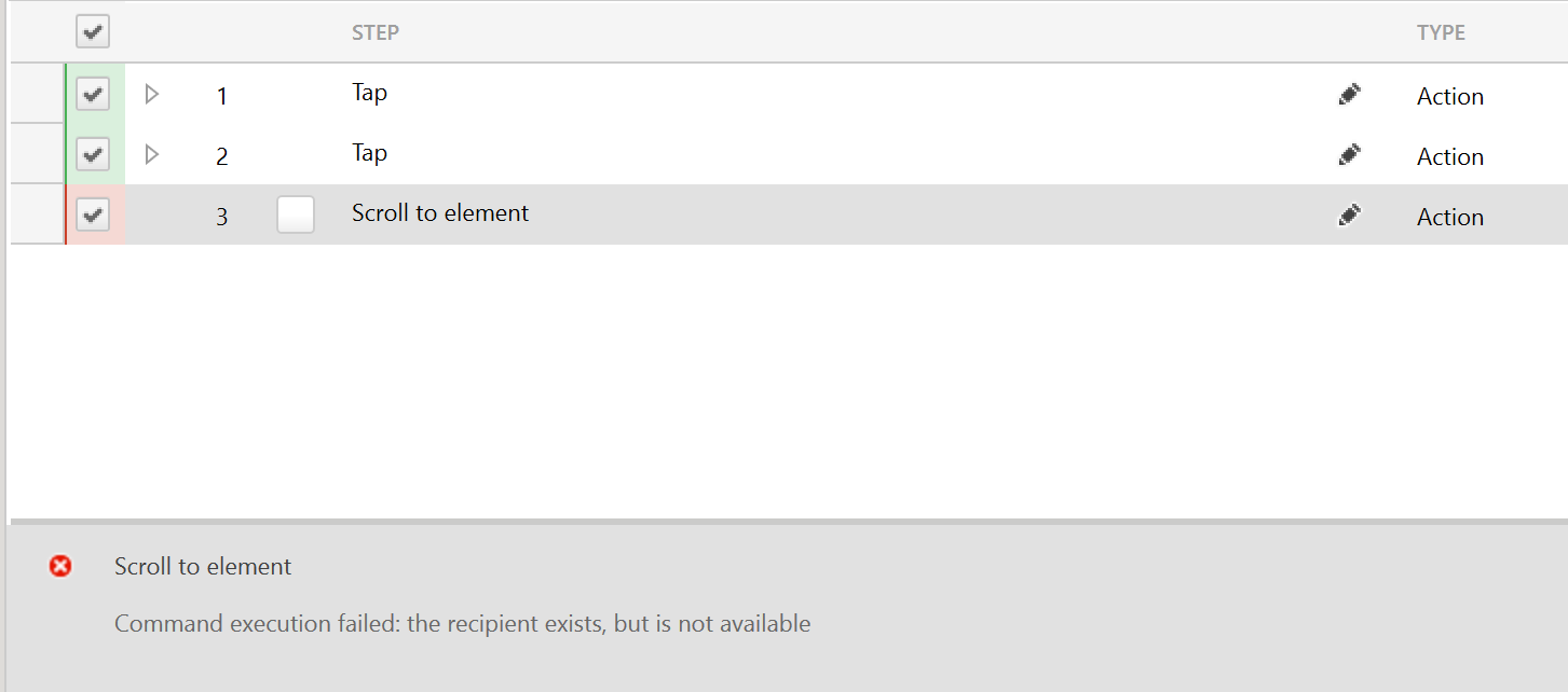 I am working on the Mobile Web Test with Physical Test Phone. I try set "Scroll to Element", "Tab", or "Set Value" action through DOM Explorer. But when I execute, it returns "Command execution failed: the recipient exists, but is not available". How could I fix it?