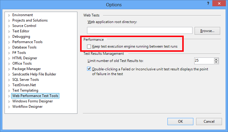 About the vstest.executionengine.exe error you are experiencing, it is a bug in JustMock which we have already fixed and this fix will be included in the next official release. A workaround I can suggest is to uncheck the "Keep test execution engine running between test runs" from Tools -> Options -> Web Performance Test Tools (I have attached a screenshot to guide you further).