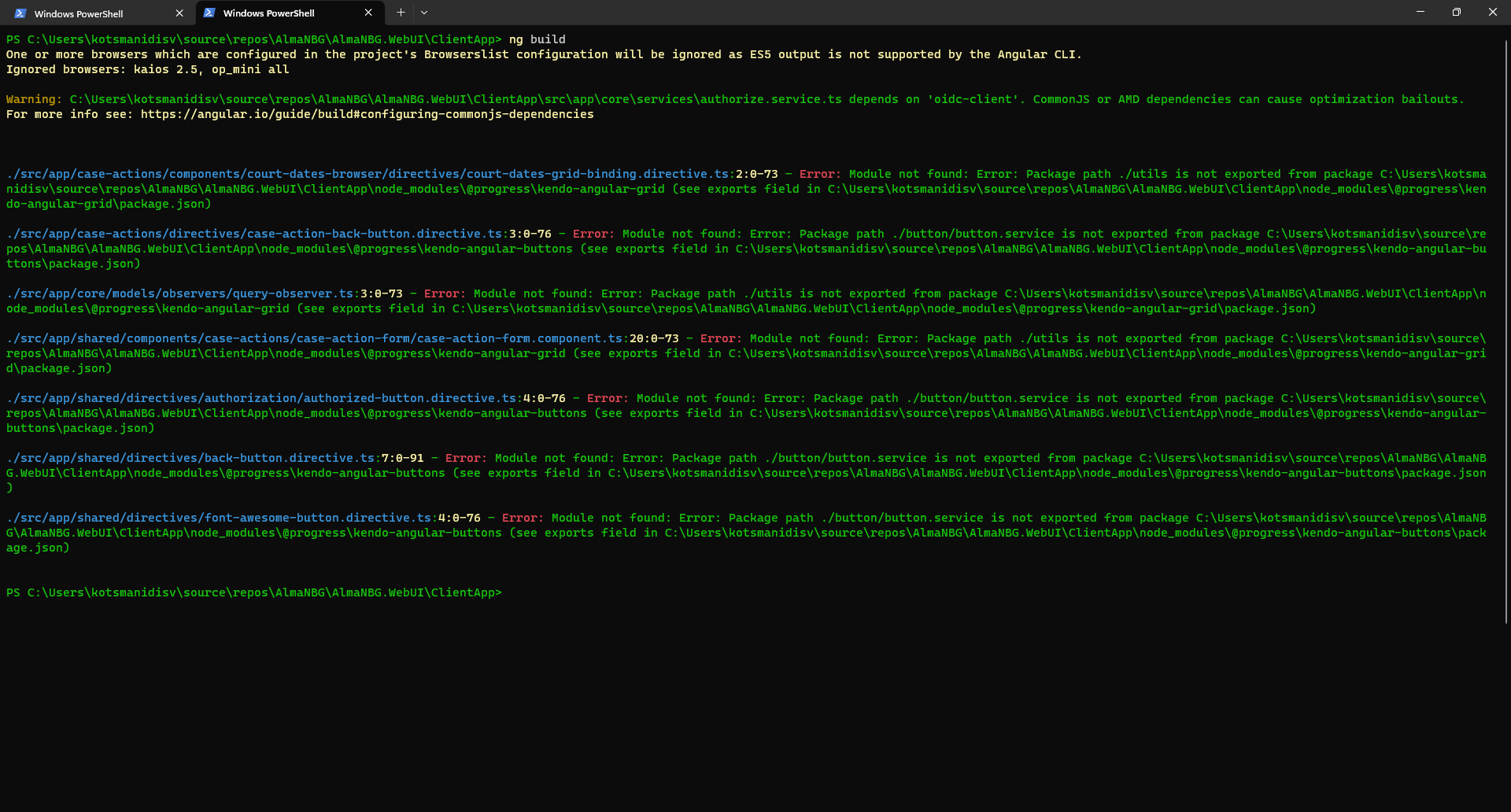 When I'm trying to import anything from @progress/kendo-angular-grid/utils and the button.service from @progress\kendo-angular-buttons, the IDE recognizes correctly the folder address and imports everything automatically without problems. When I'm trying to build or serve the application, though, it cannot find the packages under no circumstances. I tried to modify the path in the IDE, prefixed with 'node_modules', no result. I have discarded the node_modules folder and cleared the npm cache many times, again no result. I also uninstalled and reinstalled everything from the kendo libraries and any dependencies, again no result.