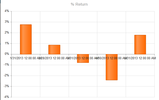 Html.Kendo().Chart<AccountPerformance>(Model.Results) .Name("chartPCT") .Title("% Return") .Legend(legend => legend.Visible(false)) .Series(series => series.Column(model => model.Metrics.Return) .Name(Model.ColumnTitle) .Labels(false) ) .ValueAxis(axis => axis.Numeric() .Labels(labels => labels.Format("{0}%"))) .CategoryAxis(axis => axis .Categories(model => model.Observation) .Labels(labels => { labels.Format("MMM"); })) .Render();10 Answers, 1 is accepted