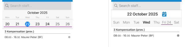 2) Regarding to the selection in the week view area, the Scheduler is a new component different than the Xamarin and there isn't a day selection in the schedule view. You can select dates using the calendar picker from the header area.