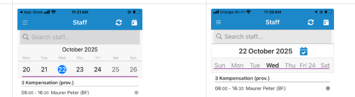 Mon, Tue, Wed, etc.), but Friday is Fri 24 (with its date). If this is not configurable we should report it to Telerik.Regarding tapping on the day names, we have the following feature request: https://feedback.telerik.com/maui/1671991-scheduler-add-day-tap-command-for-multidayview It is for multi day view, however, the week view is a modification of the multi day view. For now I cannot suggest an alternative approach to workaround the missing feature.