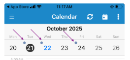 I have reviewed the iOS native calendar and such shapes/dots/indicators are not presented in the day, multiday modes. Note that the MAUI Scheduler control follows the platform design guidance. However, regarding to the day names in the Scheduler MultiDay/Week View, I have opened a feature request on your behalf: https://feedback.telerik.com/maui/1702666-scheduler-provide-template-for-the-day-names-area-for-week-and-multiday-view-modes , so we can expose a template for customizing the area in a way you want. In this way you can add shapes to address appointments.