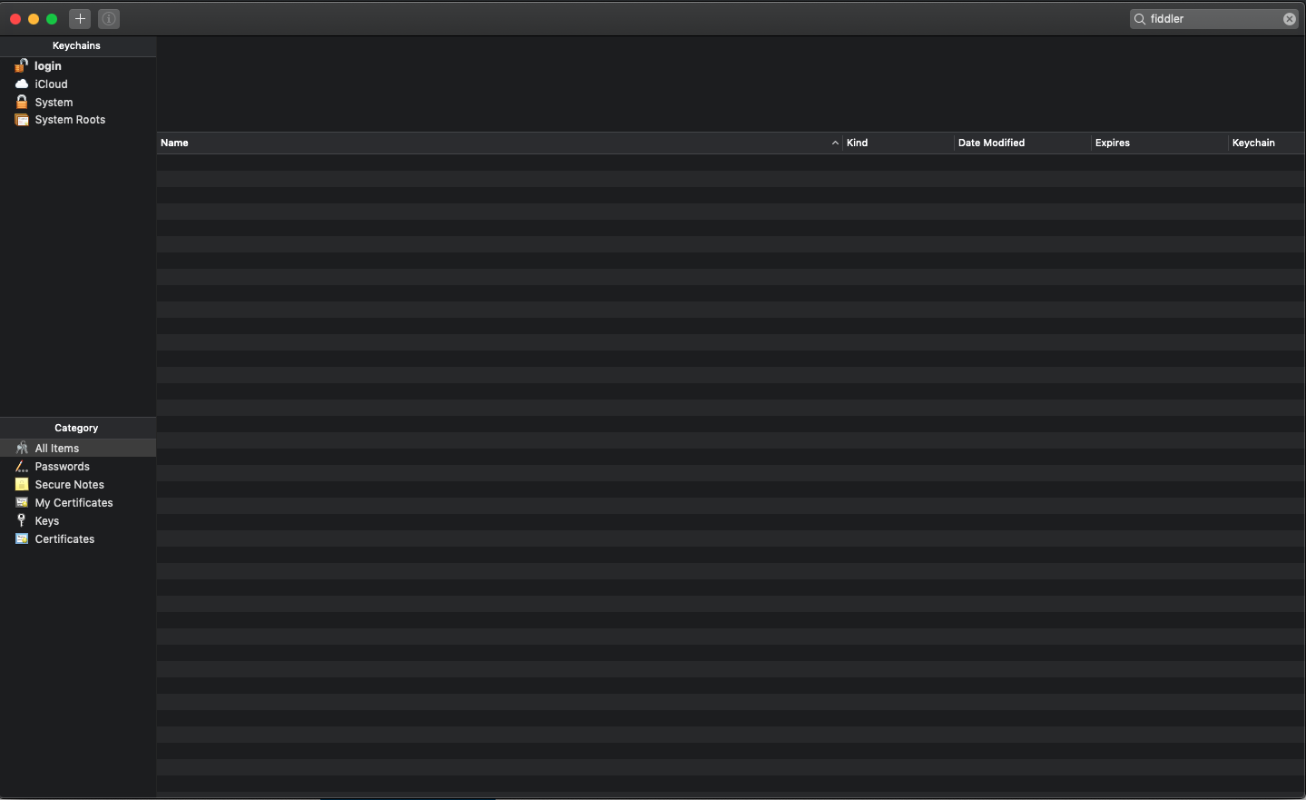 4. I don't have any 'fiddler' cert in my keyChain - See attached image.