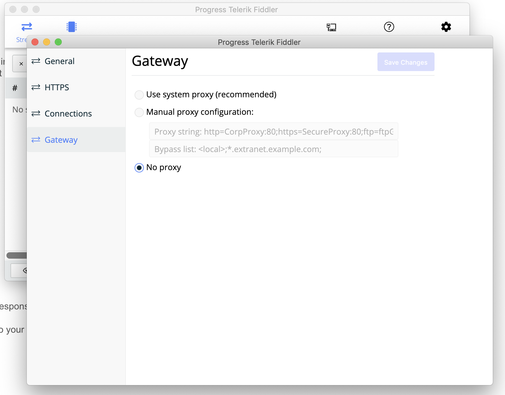 Mac proxy settings when Fiddler Everywhere is running.