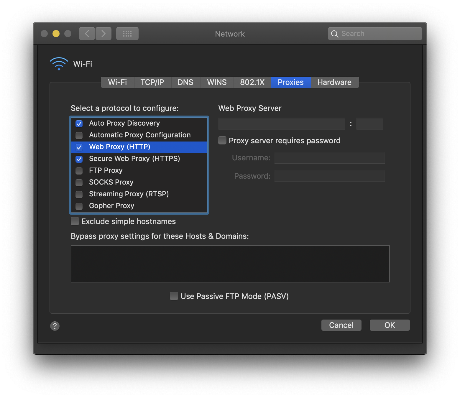 - Select active network, then hit the Advanced button, open the Proxies tab