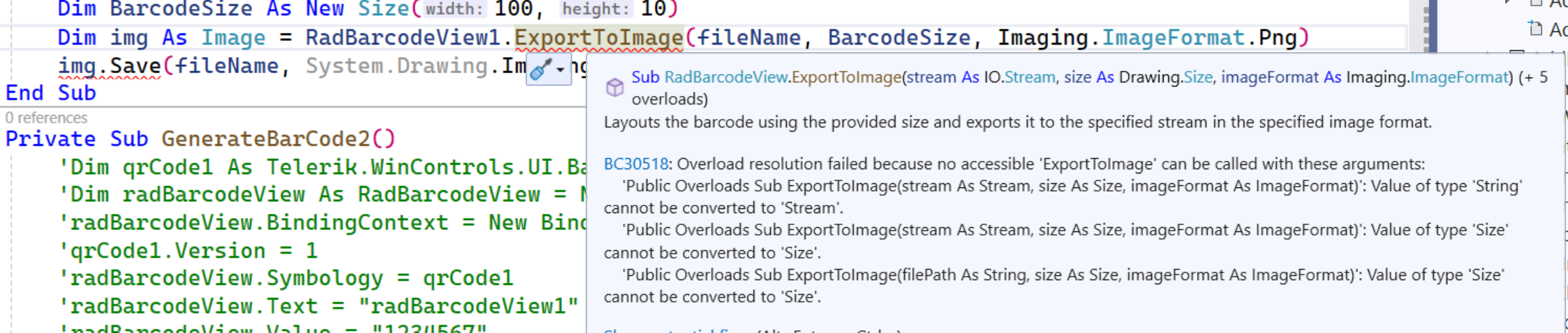 Dim img As Image = RadBarcodeView1.ExportToImage(fileName, BarcodeSize, Imaging.ImageFormat.Png)
