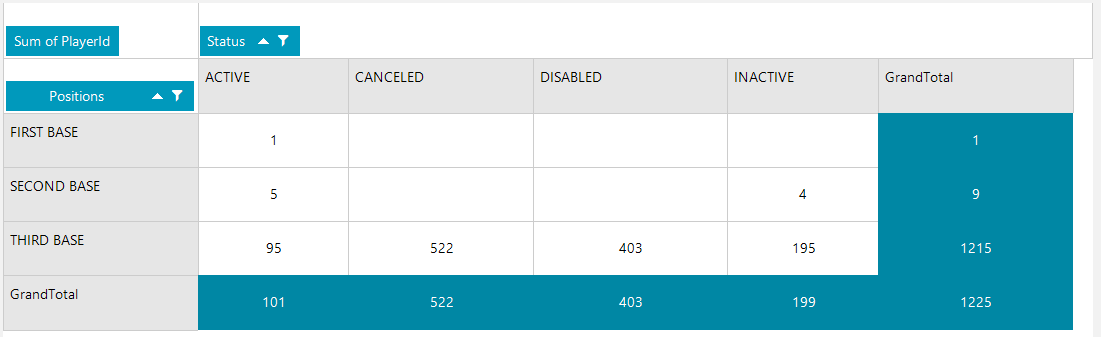 We have to make this generic enough for our end users to change out any additional columns that may be in the data source.  I do know a way of doing this by changing the result query to GroupJoin the playerList into the Positions and Statuses lists, and then in the PivotGrid, instead of using the COUNT aggregate, use the SUM on a new field that has a 1 or 0 in it.   But this is not going to be generic for our users to understand.   My guess, this is probably the only solution to this problem but I wanted to reach out to see if there was a way to do that w/out having to change what aggregate expression is used.