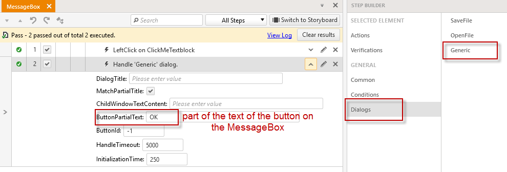 Try to add a step from the step builder - Dialogs -> Generic dialog. Adjust in the Handle 'Generic' dialog step - the "ButtonPartialText" property to contain a part of the text from the button that handle the box.