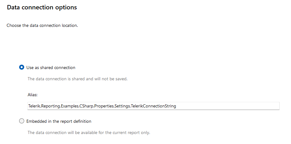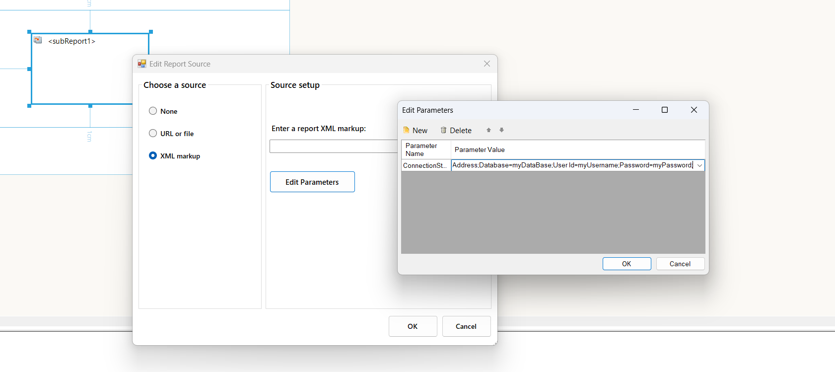 Still, in your scenario, it is not actually necessary to pass the connectionString as a parameter. The subreport can read it from the appsetting.json file. So if you do not plan to change connections, just use the same connection alias everywhere and remove the connection string bindings.