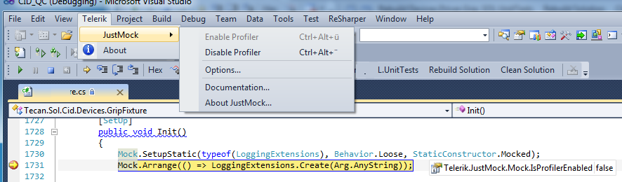 I have installed the commercial version of JustMock. When I run a NUnit-Test using the ReSharper-TestRunner in Visual Studio 2010 the JustMock Profiler is never enabled (Telerik.JustMock.IsProfilerEnabled=false). In the Visual Studio menu 'Telerik -> JustMock -> Enable Profiler' is grayed out (disabling and enabling didn't help ). The Windows EventViewer shows that the profiler has been started: