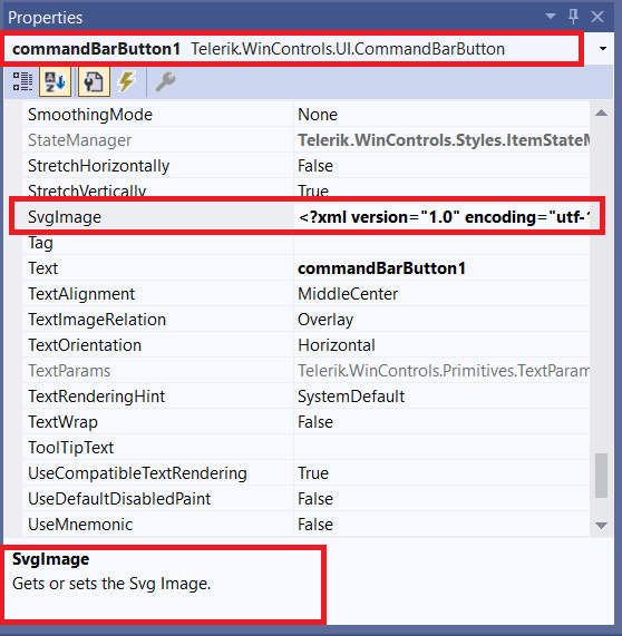 Yes, you can use any image or SVG image of your choice and apply it to CommandBarButton. RadControls support displaying svg images: Support for vector graphics.To do so, in design time, go to the Properties window and select the commandBarButton that you wish to assign an image to. Then, find the SvgImage or Image property and use a suitable image for the button: