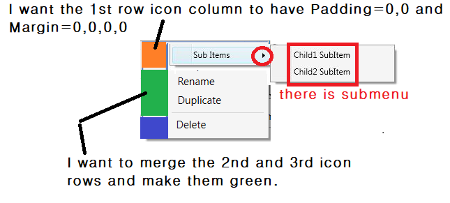 Please check the attached file: contextmenu.pngI want the 1st row icon column to have Padding=0,0 and Margin=0,0,0,0
