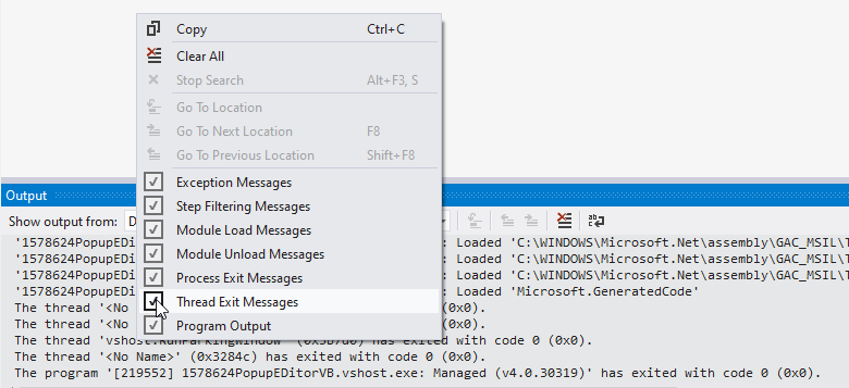 I have already found this articles but I think the solution isn't just to disable thread exit messages. The reason I wrote to you is because this happens only when I use a RadDropDownList. Which means that apparently, something is "wrong" with RadDropDownList's code(?). Because, for example, if I do the same thing with a simple comboBox nothing happens!!!