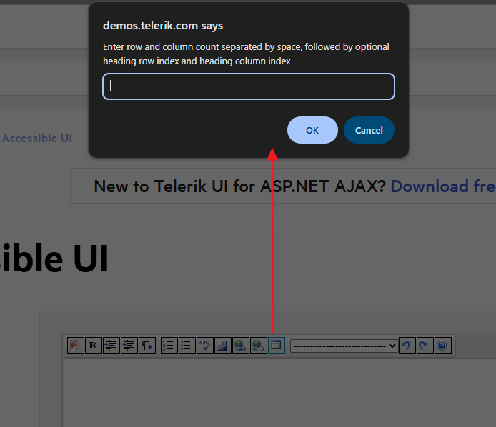 All of these buttons are accessible by the keyboard. You can find the list of all toolbar tools in this article: https://www.telerik.com/products/aspnet-ajax/documentation/controls/editor/functionality/toolbars/overview#full-set-of-tools-setup<telerik:EditorTool Name="InsertRowAbove" /> <telerik:EditorTool Name="InsertRowBelow" /> <telerik:EditorTool Name="DeleteRow" /> <telerik:EditorTool Name="InsertColumnLeft" /> <telerik:EditorTool Name="InsertColumnRight" /> <telerik:EditorTool Name="DeleteColumn" /> <telerik:EditorSeparator></telerik:EditorSeparator> <telerik:EditorTool Name="MergeColumns" /> <telerik:EditorTool Name="MergeRows" /> <telerik:EditorSeparator></telerik:EditorSeparator> <telerik:EditorTool Name="SplitCell" /> <telerik:EditorTool Name="SplitCellHorizontal" /> <telerik:EditorTool Name="DeleteCell" /> <telerik:EditorTool Name="SetCellProperties" /> <telerik:EditorTool Name="SetTableProperties" /> - You can switch to the <telerik:AccessibleRadEditor > editor where the Table command shows a prompt where the user can enter numeric values to create and insert a table element in the content area: https://demos.telerik.com/aspnet-ajax/editor/examples/accessibleeditor/defaultcs.aspx
