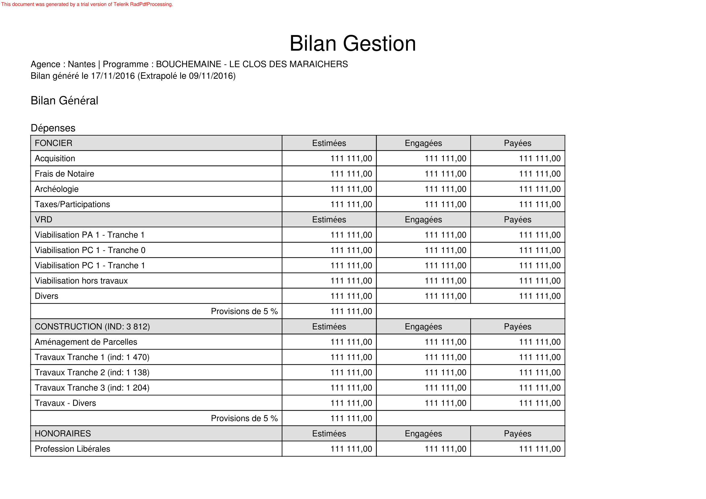 Dim document As New RadFixedDocumentUsing Editor As Editing.RadFixedDocumentEditor = New Editing.RadFixedDocumentEditor(document) With Editor .SectionProperties.PageSize = A4P .SectionProperties.PageMargins = New Telerik.Windows.Documents.Primitives.Padding(48.768) 'Titre Genéral .ParagraphProperties.HorizontalAlignment = Editing.Flow.HorizontalAlignment.Center .CharacterProperties.FontSize = 34 .InsertParagraph() .InsertLine("Bilan Gestion") ' ... here call my generate headerFor Each bilan In Bilans.CharacterProperties.FontSize = 18 .InsertLine(String.Format(maskTypeBilan, Francelot.BilanGestion.Utils.ConvertTypeSousBilanToStr(bilan.TypeBilan))) 'Depenses .CharacterProperties.FontSize = 16 .InsertLineBreak() .InsertLine("Dépenses") .CharacterProperties.FontSize = 14 'Appel Génération Table For Each Depense In bilan.Depenses.Repartition Dim depenseTable As Editing.Tables.Table = Depense.ForPDF() .InsertTable(depenseTable) Next 'Recettes .CharacterProperties.FontSize = 16 .InsertLineBreak() .InsertLine("Recettes") .CharacterProperties.FontSize = 14 'Appel Génération Table Dim grpList As New List(Of String) For Each Recette In bilan.Recettes.Repartition If Not IsNothing(Recette.NomGroupe) AndAlso Not grpList.Contains(Recette.NomGroupe) Then grpList.Add(Recette.NomGroupe) .InsertLine(Recette.NomGroupe) End If Dim recetteTable As Editing.Tables.Table = Recette.ForPDF() .InsertTable(recetteTable) Next Next End WithEnd Using