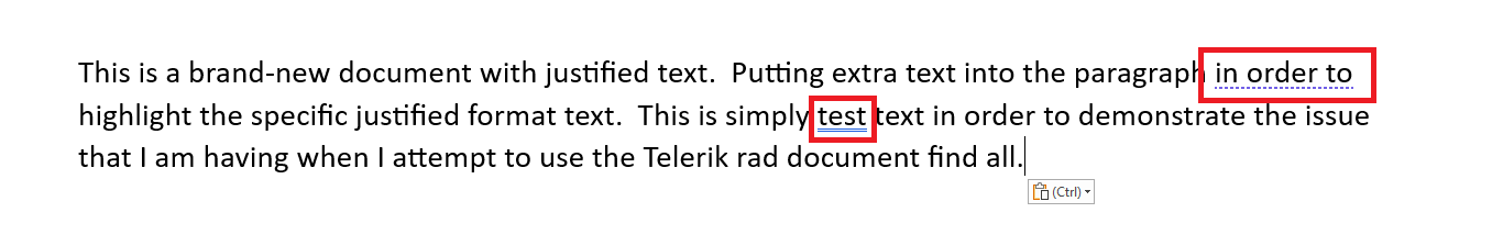 "This is a brand-new document with justified text. Putting extra text into the paragraph in order to highlight the specific justified format text. This is simply test text in order to demonstrate the issue that I am having when I attempt to use the Telerik rad document find all."