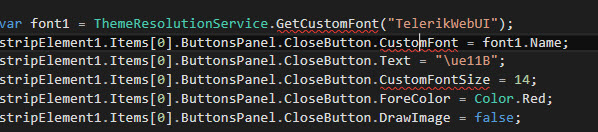 var font1 = ThemeResolutionService.GetCustomFont("TelerikWebUI");stripElement.Items[0].ButtonsPanel.CloseButton.CustomFont = font1.Name;stripElement.Items[0].ButtonsPanel.CloseButton.Text = "\ue11B";stripElement.Items[0].ButtonsPanel.CloseButton.CustomFontSize = 14;stripElement.Items[0].ButtonsPanel.CloseButton.ForeColor = Color.Red;stripElement.Items[0].ButtonsPanel.CloseButton.DrawImage = false;More information about glyphs and the TelerikWebUI font is available here: https://docs.telerik.com/devtools/wpf/styling-and-appearance/glyphs/common-styles-appearance-glyphs-overview