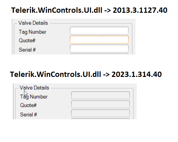 We are using RadTextBox the version is Telerik.WinControls.UI.dll -> 2023.1.314.40. And setting the backcolor is 'System.Drawing.SystemColors.Control' but its showing screen transparent color(gray- this is not correct).