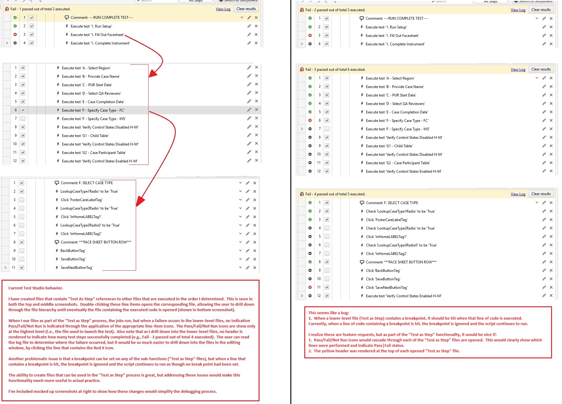 The screenshot illustrates the current behavior and how it might look if these elements were to cascade through all files or "Test as Step" commands.