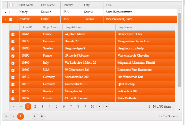 One possible approach that would allow the developer to select all rows inside the detail Grid of a specific parent row that has been selected by the user would be to utilize the built-in SelectionDirective for the two components: