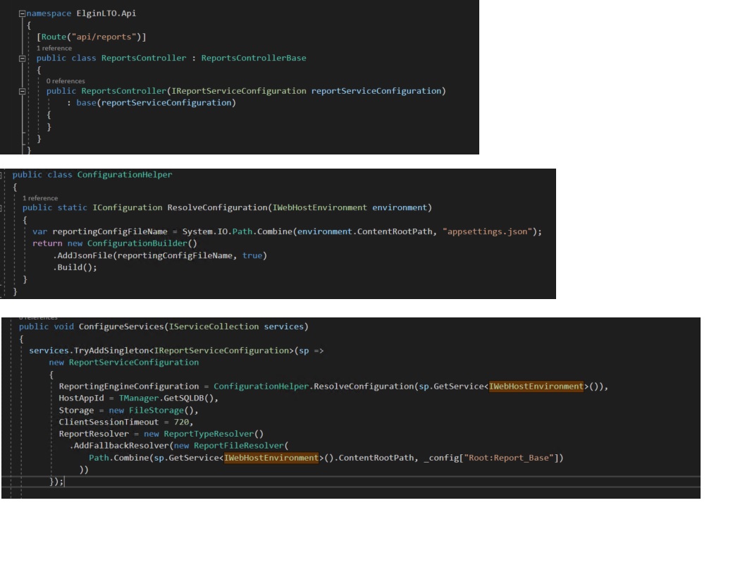 The ReportServiceConfiguration object is set up in Startup.cs and draws on the ConfigurationHelper method called ResolveConfiguration.
