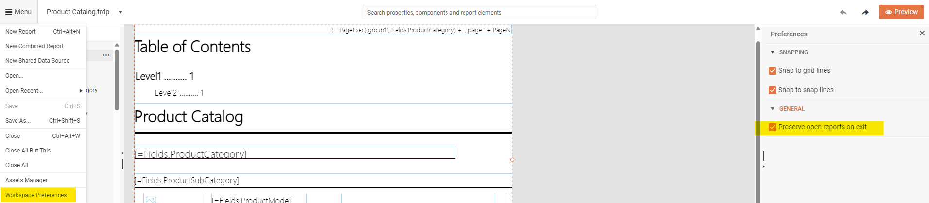 Menu -> Workspace Preferences -> General -> Preserve open reports on exit