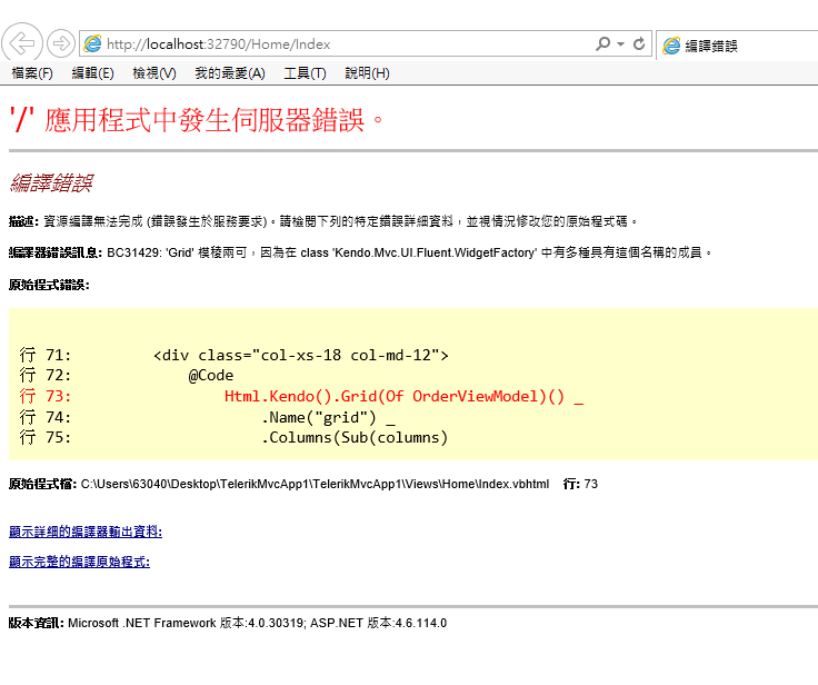 執行後發生這個錯誤訊息造成Kendo UI 的GRID不能用 :