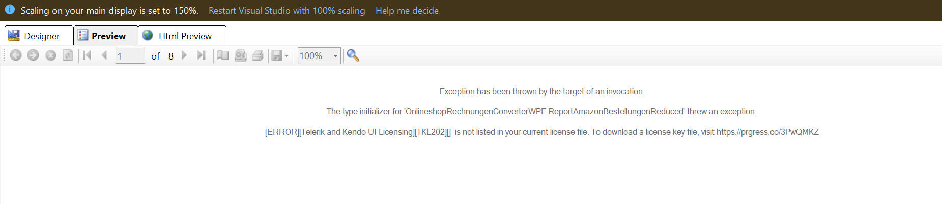 Could you please attach a trace listener to the Visual Studio Report Designer and provide the generated log file for further investigation? For guidance on how to create this log file, you can refer to the article Troubleshooting Visual Studio Report Designer. After attaching the trace listener, make sure to reproduce the issue locally so that the necessary information can be stored within the log.