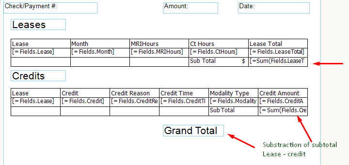 I have attached the Telerik report design SS, as I have used 2 tables Lease and credit, and from this, I want to subtract the subtotal between lease and credit and show it in the grand total. But I am stuck in that, I have tried lots of solutions but I am not achieving my result.