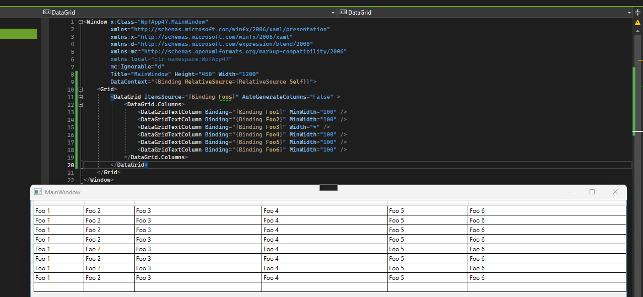 <telerik:GridViewDataColumn DataMemberBinding="{Binding Foo6}" MinWidth="100" />