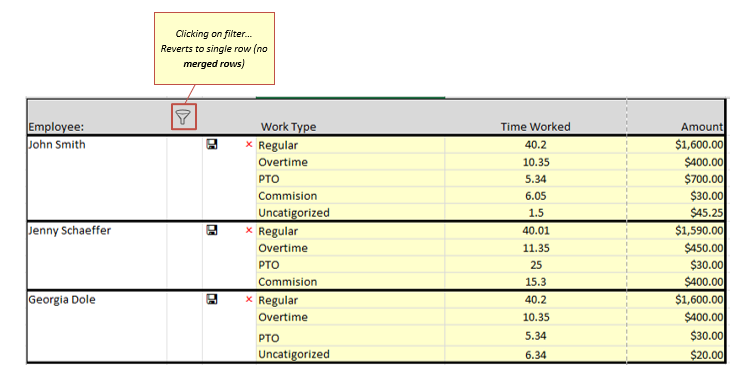 Thank you for your answer to my merged rows question previously. Now I have the problem of getting the grid contents to sustain the format if I use Filter, Clear buttons in the Filter pop up or Sort. Example: