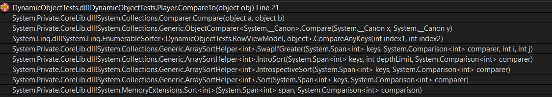 I tried setting SortMemberPath on my columns, doesn't help either. My rows are inheriting from DynamicObject, and I can see that the method TryGetMember(GetMemberBinder binder, out object result) (which I override) is indeed called when the grid starts sorting. So it seems to work well with DynamicObject, I'm not sure that having a DynamicObject could be an issue, but still, it might be worth mentioning.