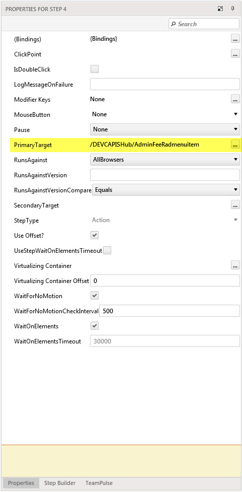 Okay, I have multiple environments (Dev, UAT, Stage and Production). Currently I am creating automated tests in our Dev environment. The idea is to use the same test to run in other environments. When I try it, I notice that nothing happens because the primary target for the element is different depending on the environment it is in. I've attached screenshots for examples, and each environment are accessed through different URLs (http://devapp/ and http://uatapp/). Is there a way to make this work? Or will I have to create a new test for each environment. Thanks in advance.