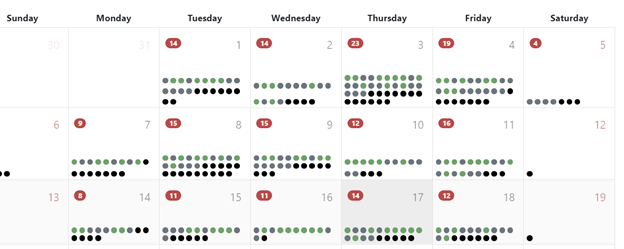 The Month view is not very useful when there are many events in a day - it currently only displays 1 or 2 event titles and then the "click for more" (ellipses) button.  I was hoping to override the template to show a summary of how many events exist for that day.  The attached screenshot shows what I am trying to achieve using an open-source calendar component.