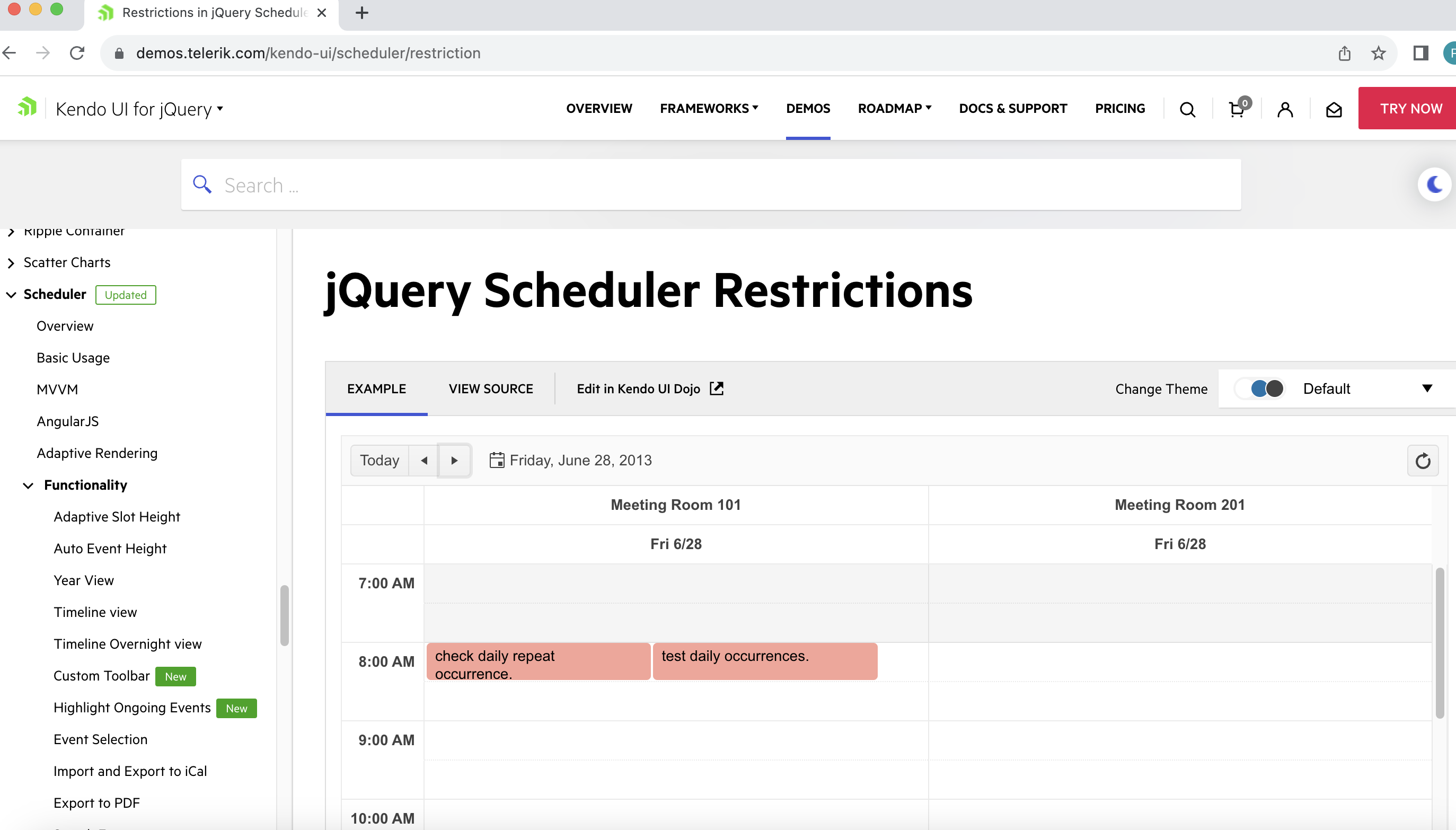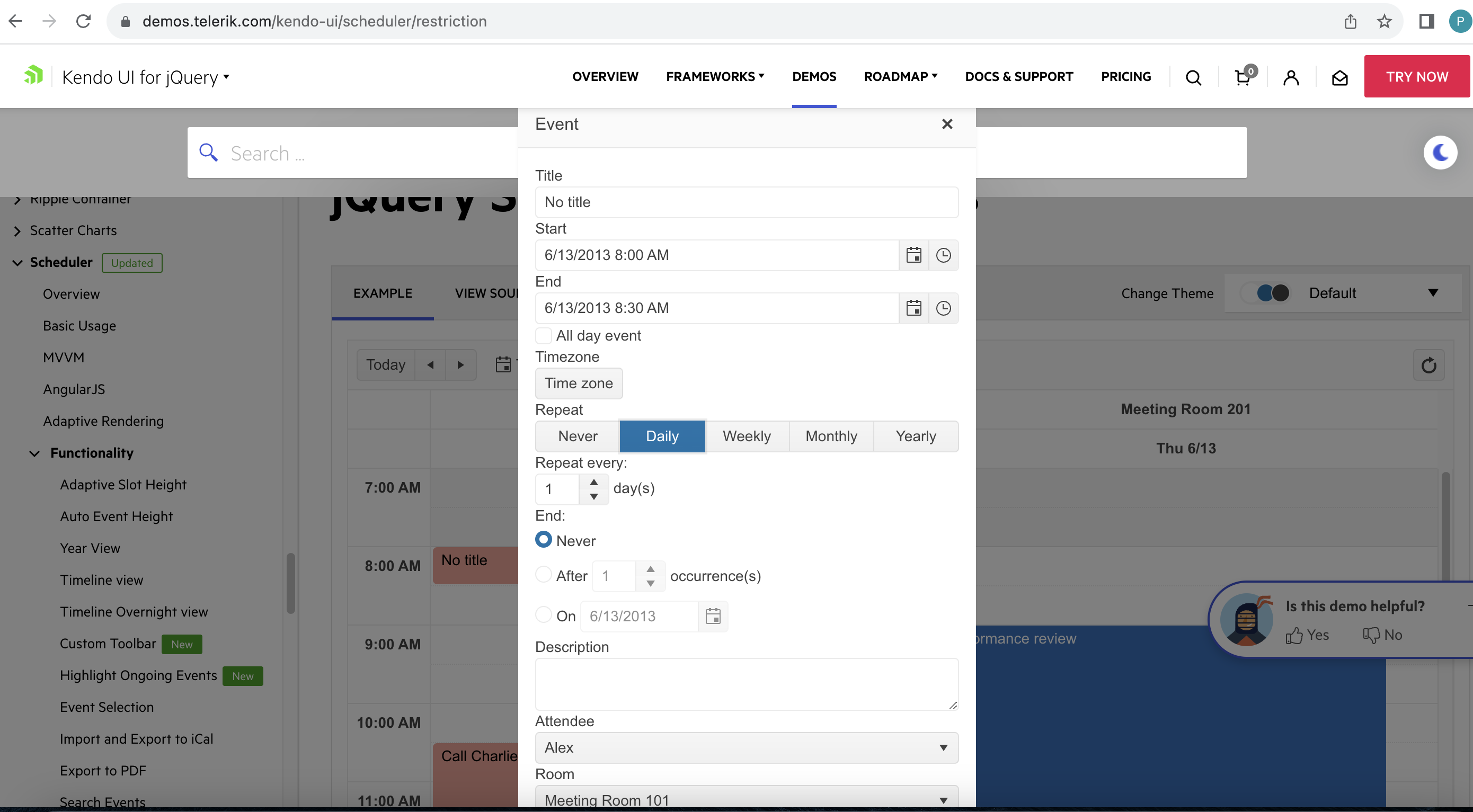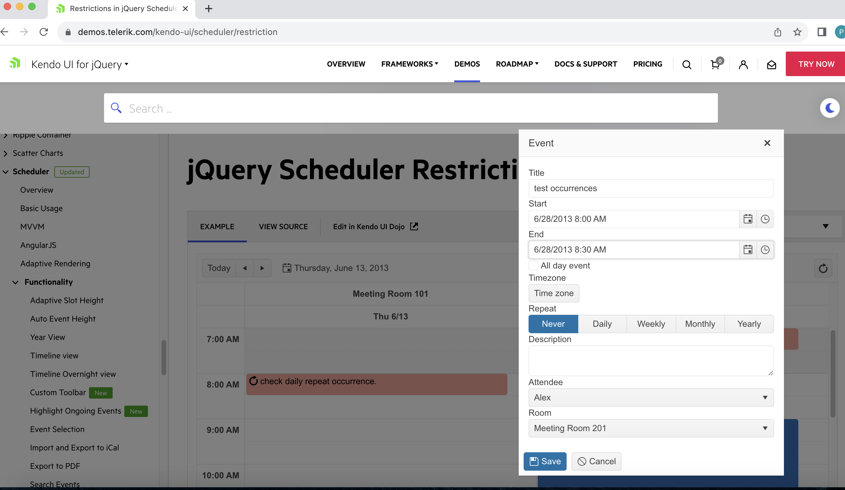 I have tested the demo Scheduler Restriction and find its not giving accurate result when we manipulate date and time. I have added event with daily repeat occurrence (PFA the same 1.png) and open another event window with different date and time and change it manually with different date but same time whose already added (PFA the same 2.png)  , hit save then its added successfully. (PFA the same 3.png)  which is wrong according to this behaviour.  its works fine when we open popup window on same date but only change time manually, problem is with changing date and time both to different ones. Hope you understand this. please resolve this asap.