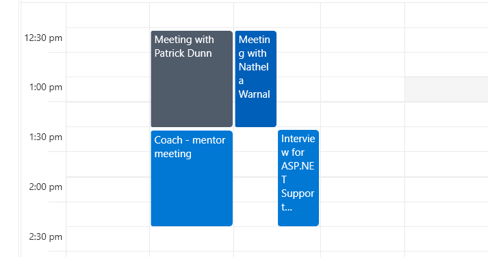 The Telerik WPF ScheduleView's appointment cells have a problem with intersecting times when assigning schedules within a one-minute timeframe. For example, when I drag and drop to assign a schedule like 12:30 PM - 1:30 PM, and then another schedule from 1:30 PM - 2:30 PM, sometimes it displays two cells in one column (as shown in the right corner), while other times it functions correctly (as shown in the left corner).