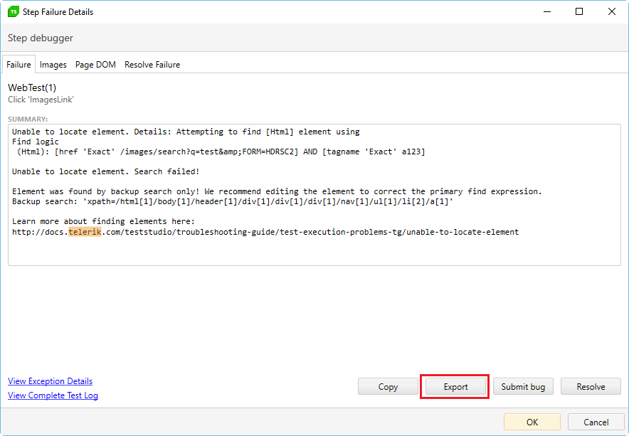 - Execute the failing test without continue on failure option and open the generated step failure details. You can analyze them to see what kind of error is causing the issue and attach the exported details (see exportStepFailureDetails.png), so I can also have a look. It is possible that the test execution is unable to find the target element on the page.