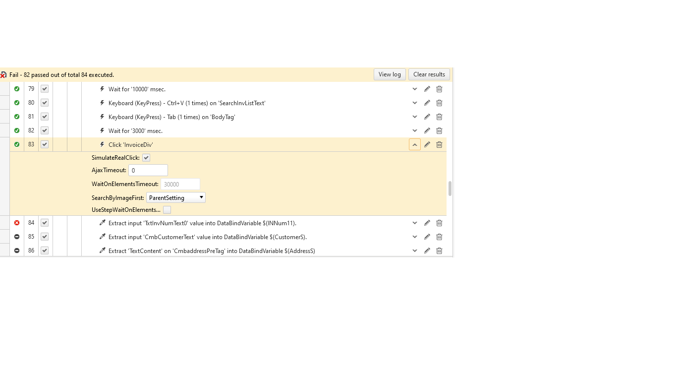 As you mentioned, step 83 is successfully executed and the test continues further to try and extract the value of the target element. I noticed that the find expression for element "InvoceDiv", which is used in step 83, uses TagIndex as a filter. This is usually not recommended, because some structural changes to the application can affect the test execution and cause it to fail. Please edit those elements and check for other attributes (like id, class or TextContent) that can help make the find expression more stable. This applies for other elements in your test, as well.
