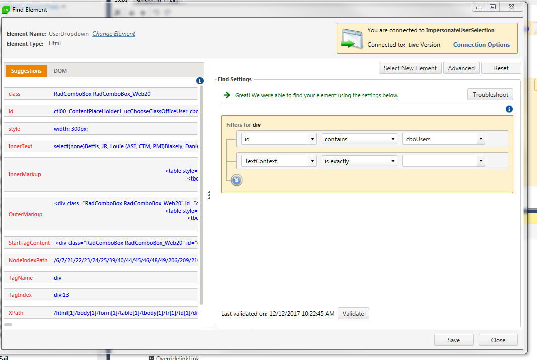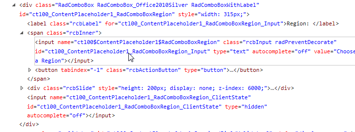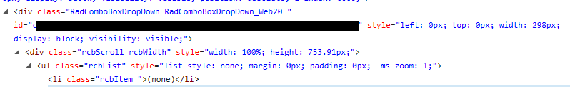 Forgive the potential confusion, I'm still new to Telerik. Our RadComboBoxes are only defined using the id in the Element definition. Using the text in a combo box option seems a strange way to define the combo box. But I'm coming from the world of Selenium. If I'm following you correctly, you are suggesting using the InnerText contains 'somevalue'. The problem is that I'm seeing an innertext that shows the entire list of the names in the combobox. So if I do this, anchor the box to some value partial value that it contains, you think the RadComboBox will be able to match on a partial value? I've tried it, but it doesn't seem to work from what I can tell. I've attached a screenshot showing the inner text of the RadComboBox. I set the element to be defined by: