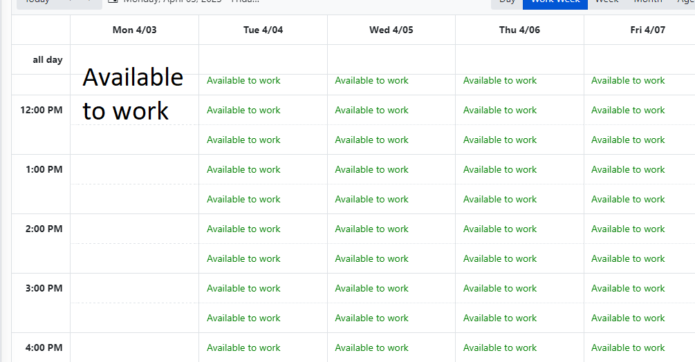 The user should just see 1 instance for the entire work day that says 'available to work'.